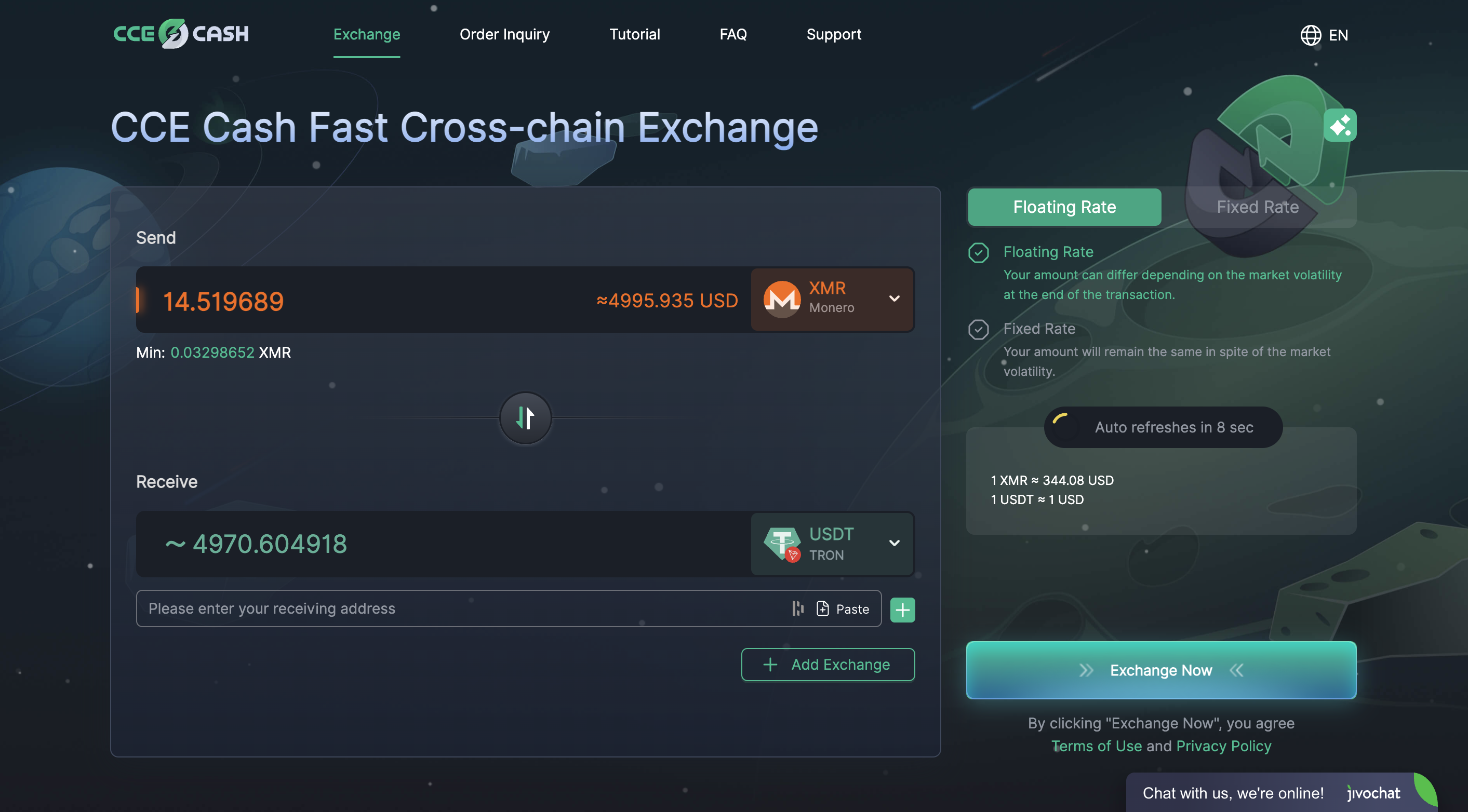 The exchange includes major cryptocurrencies, stablecoins, and privacy-focused assets, allowing users to swap between widely used digital currencies as well as more specialized tokens. Because swaps are executed through integrated liquidity sources, availability may vary depending on network conditions and asset demand at the time of the transaction.