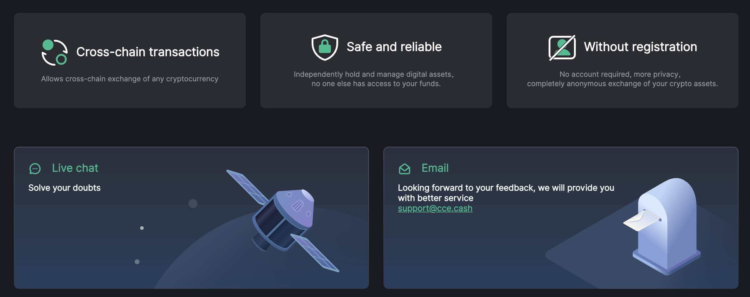 CCE.Cash is built around a simple, non-custodial swap process. There are no accounts, dashboards, or trading interfaces, every transaction is handled as a direct crypto exchange between wallets.