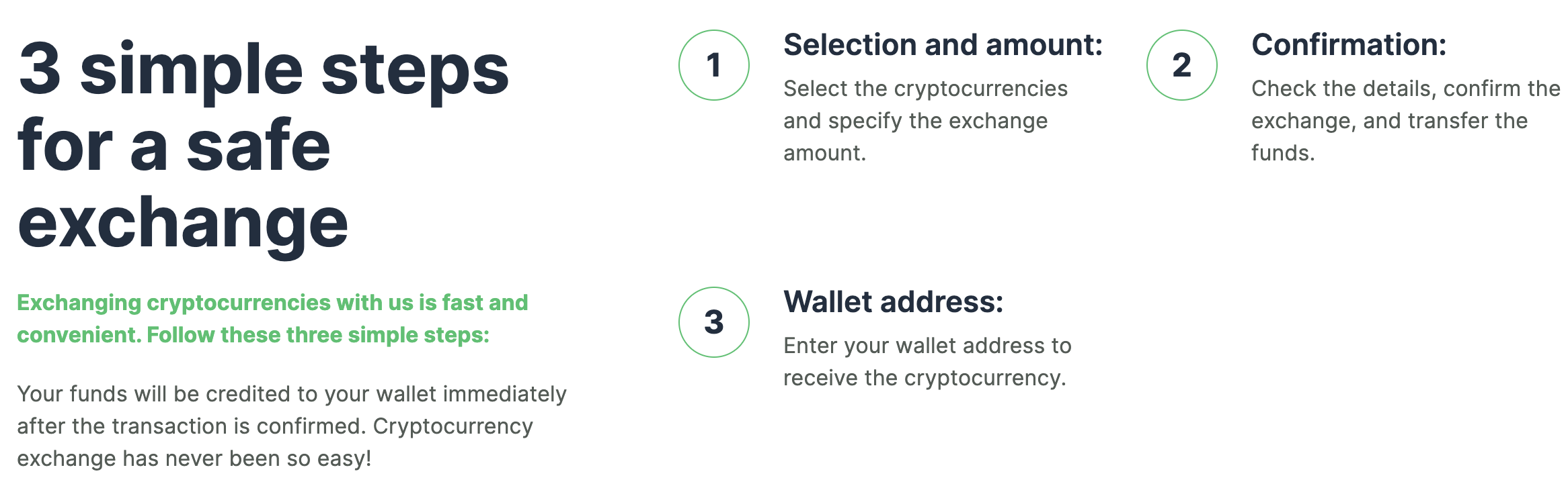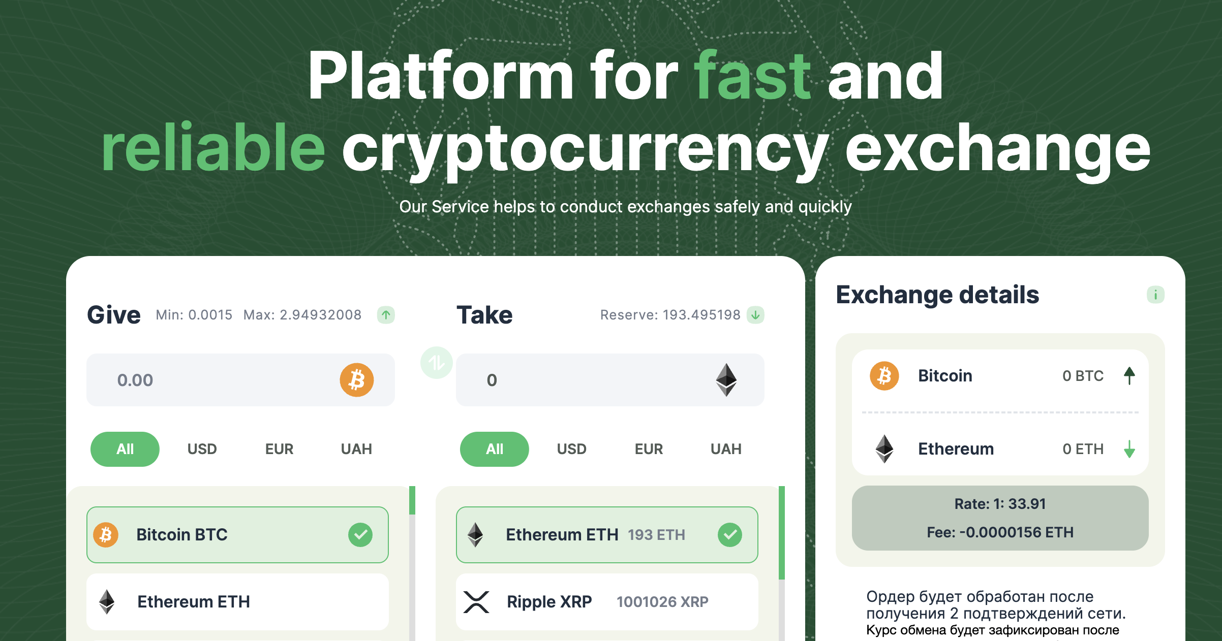 - Fast execution: Exchanges are processed once the incoming blockchain transaction is confirmed.