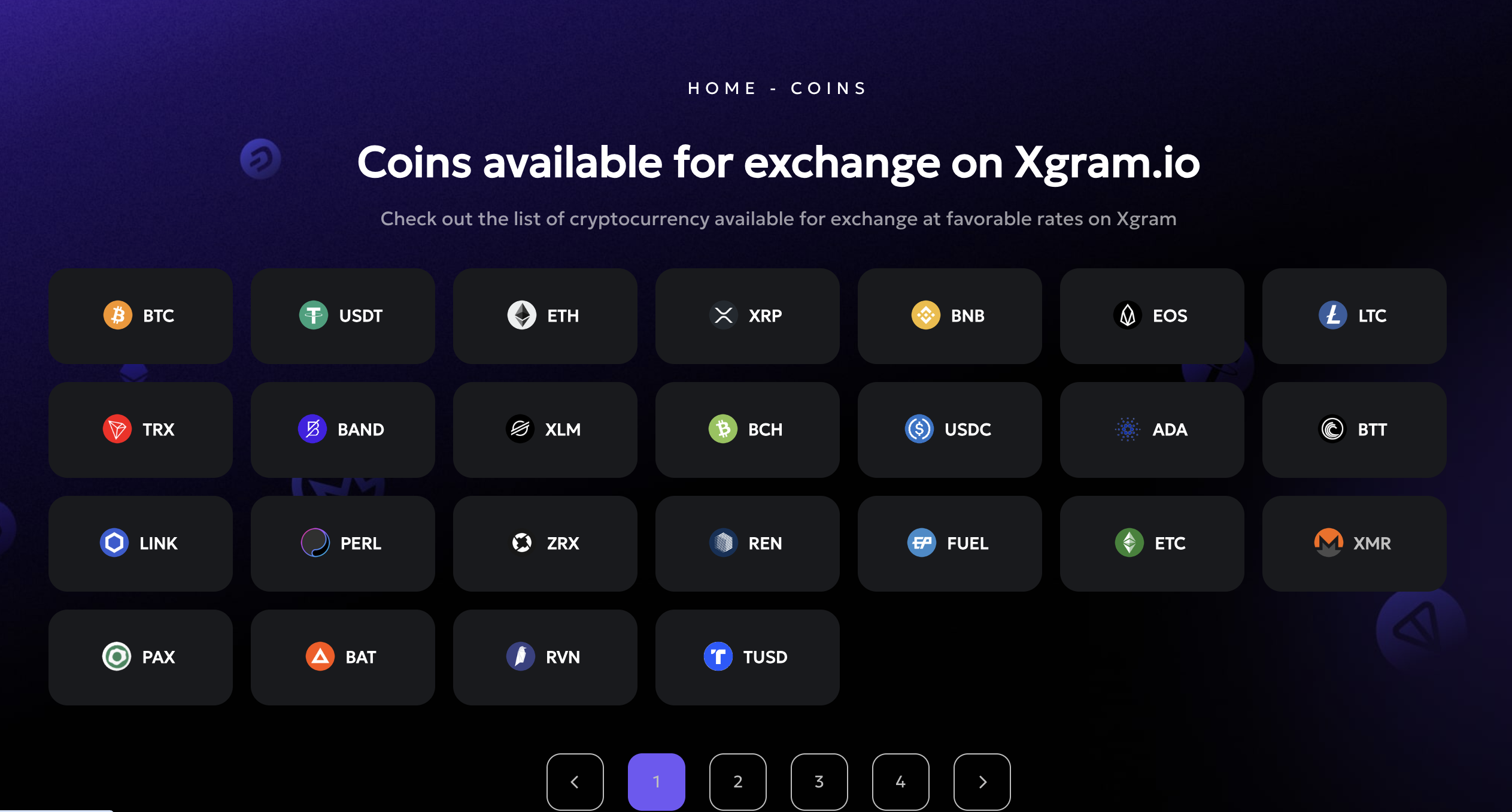 These are the assets currently displayed on the Xgram “Coins available for exchange” page:
