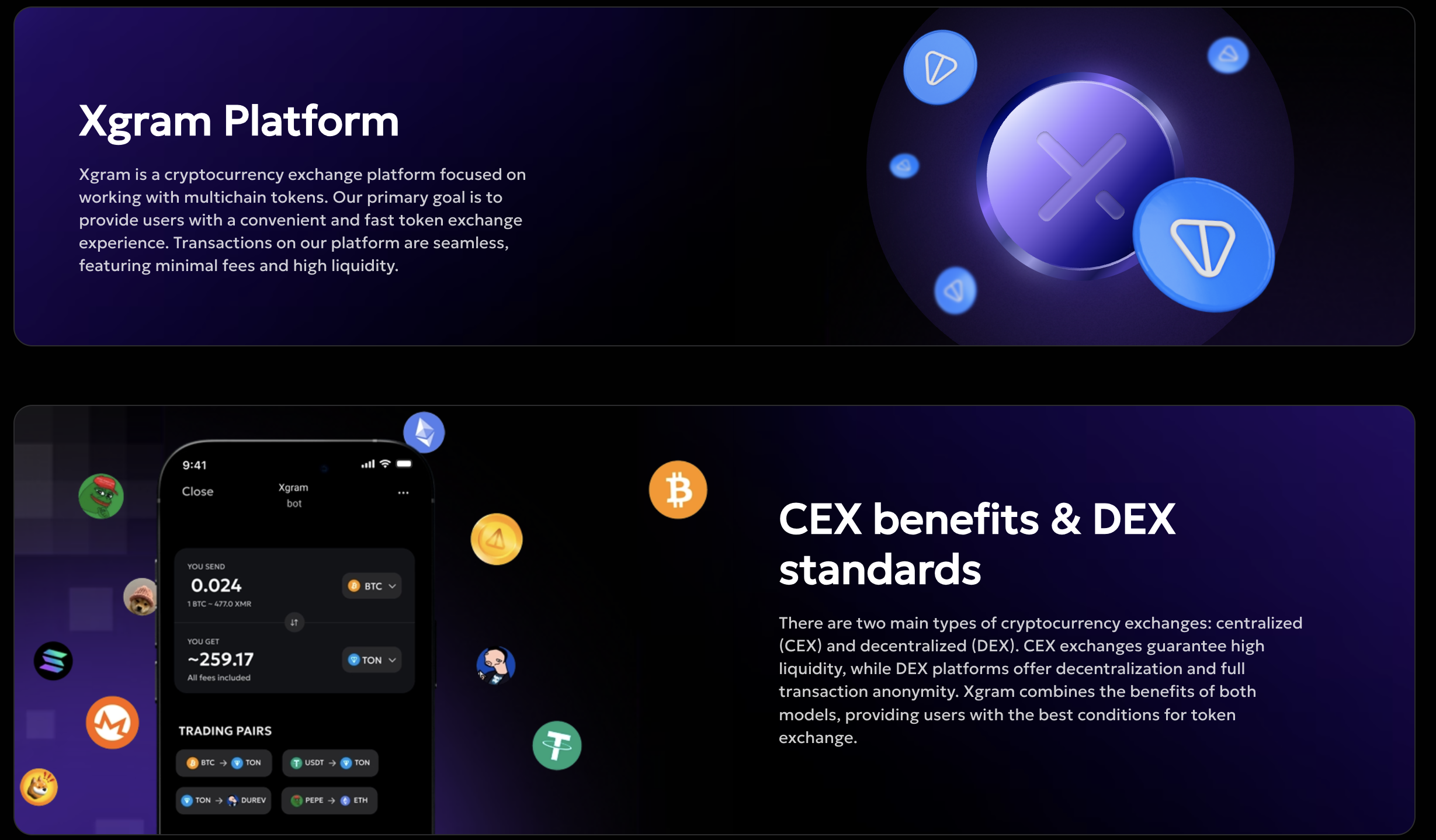 Xgram supports 400+ cryptocurrencies across major networks like Bitcoin, Ethereum, Tron, BNB Chain, Polygon, and TON. It allows fast cross-chain swaps (USDT, USDC, etc.) and offers liquidity from both centralized and decentralized pools, enabling instant swaps between major coins and niche altcoins without needing an exchange account.